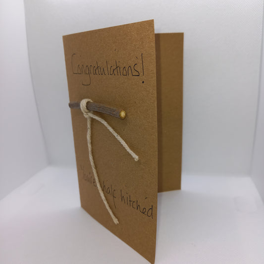 Congratulations on engagement card. Half hitch(ed) Knot on wood.